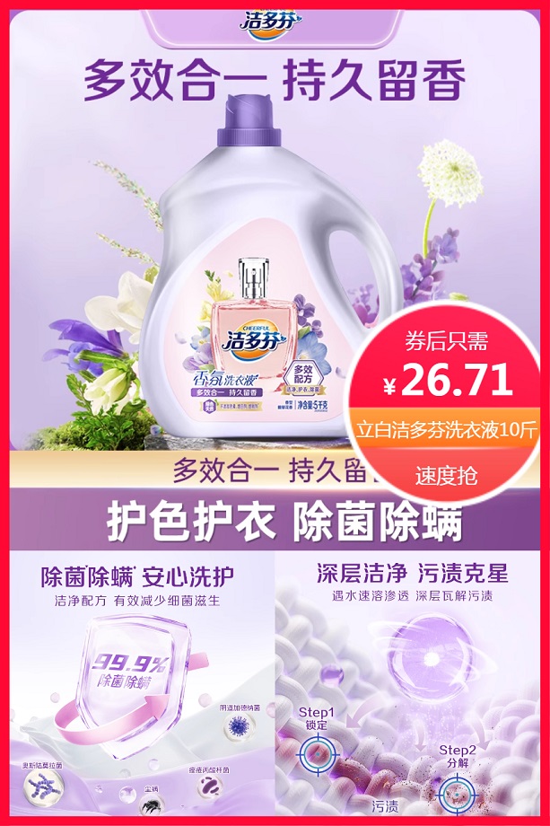 立白洁多芬薰衣草香氛洗衣液10斤,超级立减5.5元+下拉详情淘金币抵扣后约26.7元,每斤只需2.6元,叠加店铺限时红包1-2元后约24.7元,护色护衣,除菌除螨,多效合一,持久留香!锁定分解顽固污渍,遇水速溶渗透,深层瓦解污渍!