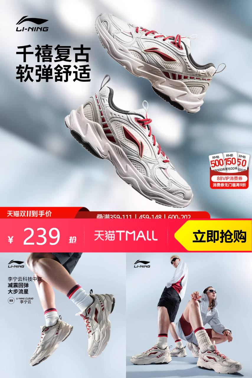 【可叠李宁大额券1000-170,运动品类券,消费9折券,9.4折购物金,到手134左右;有店铺随机立减最G19元红包】千禧复古,软弹舒适。