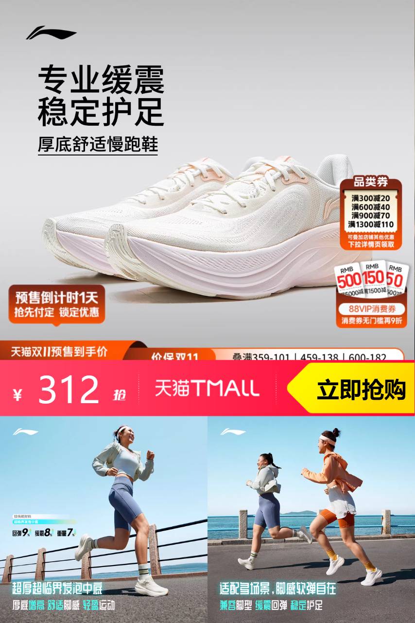 【可叠李宁大额券1000-170,运动户外品类券,消费9折券,9.4折购物金后到手165左右;】优化缓震脚感,慢跑更自在打造「越跑越柔」舒适体验~~