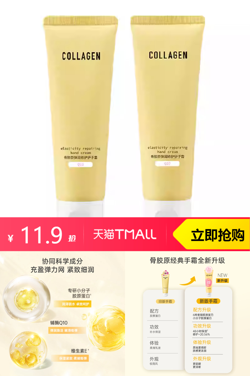 【淘金币抵1.3,88减0.6到手10,折一支5】屈臣氏骨胶原弹润护手霜80g*2,全天候保湿,即使是在干燥的冬季也能让您的双手保持水润。