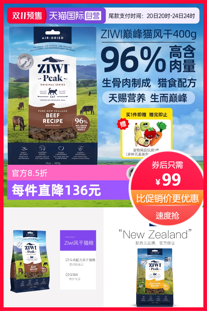 Ziwi全价风干猫粮,高肉含量,科学配比,经典再升级,双重风干锁住食材原本营养,高动物蛋白低碳水,营养摄取均衡,更易消化与吸收,保持胰岛素分泌正常,维护身体正常机能!更适合猫咪的配方!