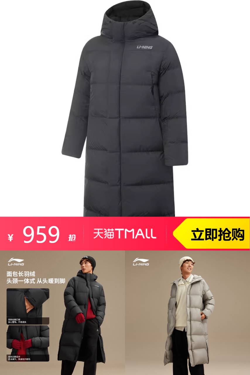 【有店铺随机立减最G19元红包,可继续叠李宁大额券1000-170,店铺券,9.5折购物金,到手597左右】面包长羽绒,包容身形, 温暖不掉线~