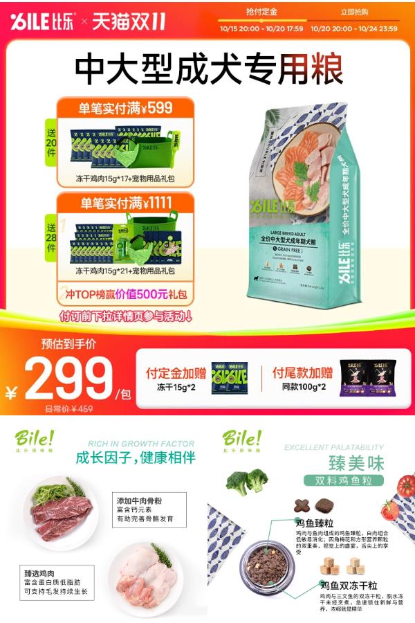 【定金50,可叠加消费券+淘金币频道补贴到手价低于264元/24斤】比乐全价犬粮鸡肉鱼肉肉源狗粮,肉蔬巧搭配,多样化饮食