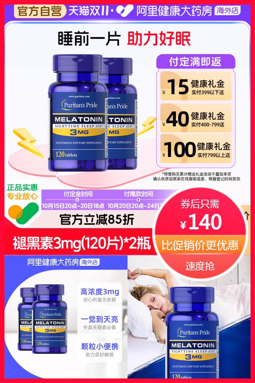 【定金30元+官方立减37元+药房自营购物券抵扣10元+88vip95折抵扣6.5元+淘金币抵扣6.99元+9折消费券抵扣11.65元到手约74.8元2瓶240粒】美国普丽普莱褪黑素小蓝瓶,美国进口,cGMP认证,品质保证,迅速改善失眠,恢复优质睡眠,无副作用,建立稳定作息