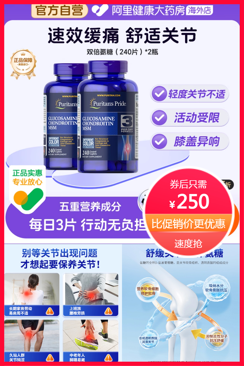【定金60元+官方立减85元+88VIP95折抵扣12.5元+9消费券抵扣23.75元到手约153.7元两瓶480粒】氨糖软骨素240粒*2瓶,关节守护神器,氨糖软骨素+MSM科学配方,5重营养成分,强化骨骼,缓解疼痛,纯度优选,行动自如每一天