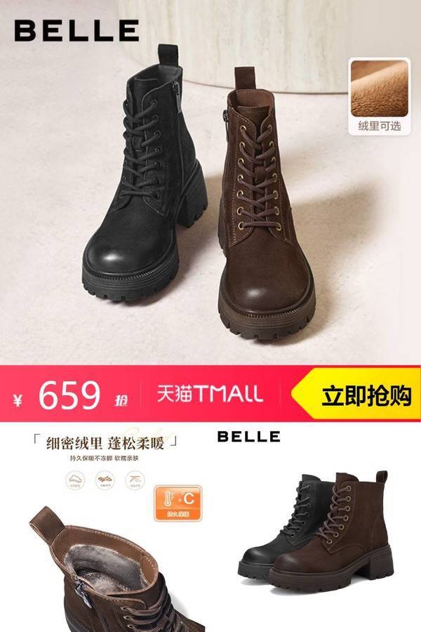 百丽 百丽复古厚底增高加绒保暖马丁靴 909元减250 商品纠错