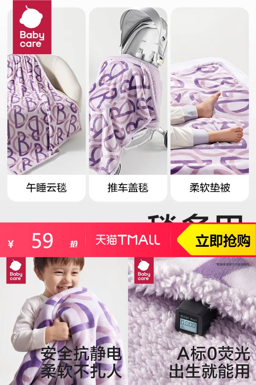 babycare双面绒毯,一面细腻亲肤,一面柔软保暖,四季通用。专为宝宝设计,安全A类标准,呵护娇嫩肌肤。轻盈不压身,锁温透气,空调房、午睡、出行皆适用。贴心细节,包边工艺牢固耐用,清洗不变形~