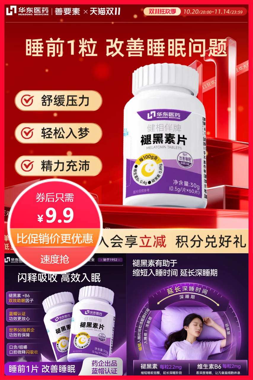 【可签到+9折消费券抵扣到手更优】华东医药褪黑素助眠片,蓝帽认证功效更放心,维生素B6+褪黑素双效助眠因子,改善多梦焦虑,舒缓压力,轻松入梦,精力充沛,口含/咀嚼口腔微释闪吸收,速抢