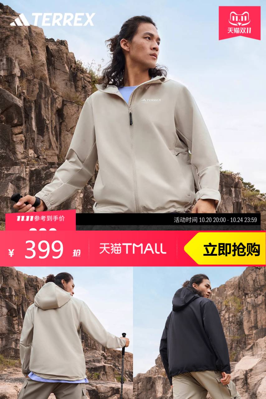 阿迪达斯户外加绒连帽软壳衣,内侧含翻毛面料,穿着舒适。