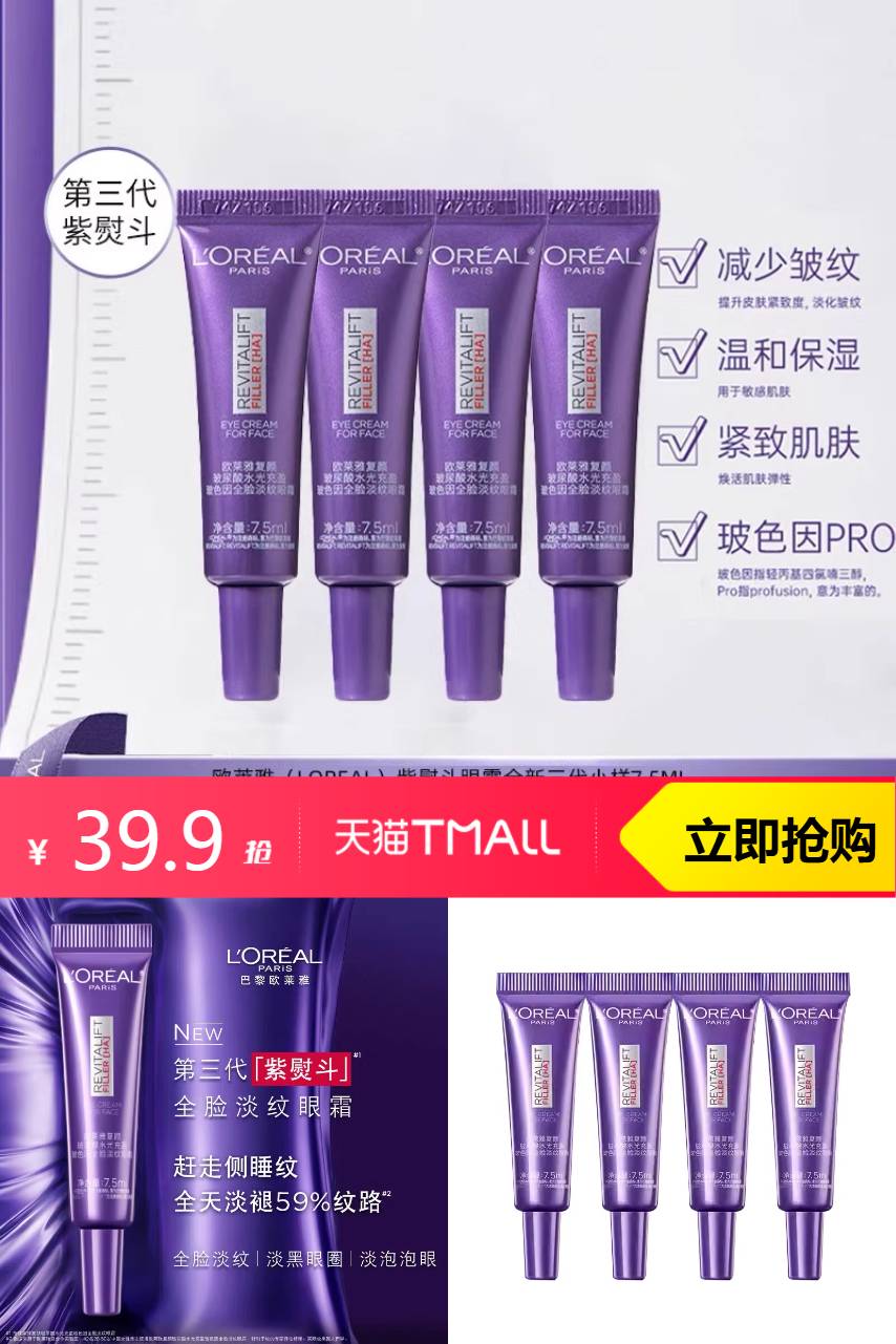 【领券减50元,淘金币可减3.39元,到手36.51元4支,划9.13元左右一支】欧莱雅!紫熨斗眼霜=速抢!淡纹!补水保湿!抗皱!提拉眼部精华!熬夜党急救!敏感肌友好!