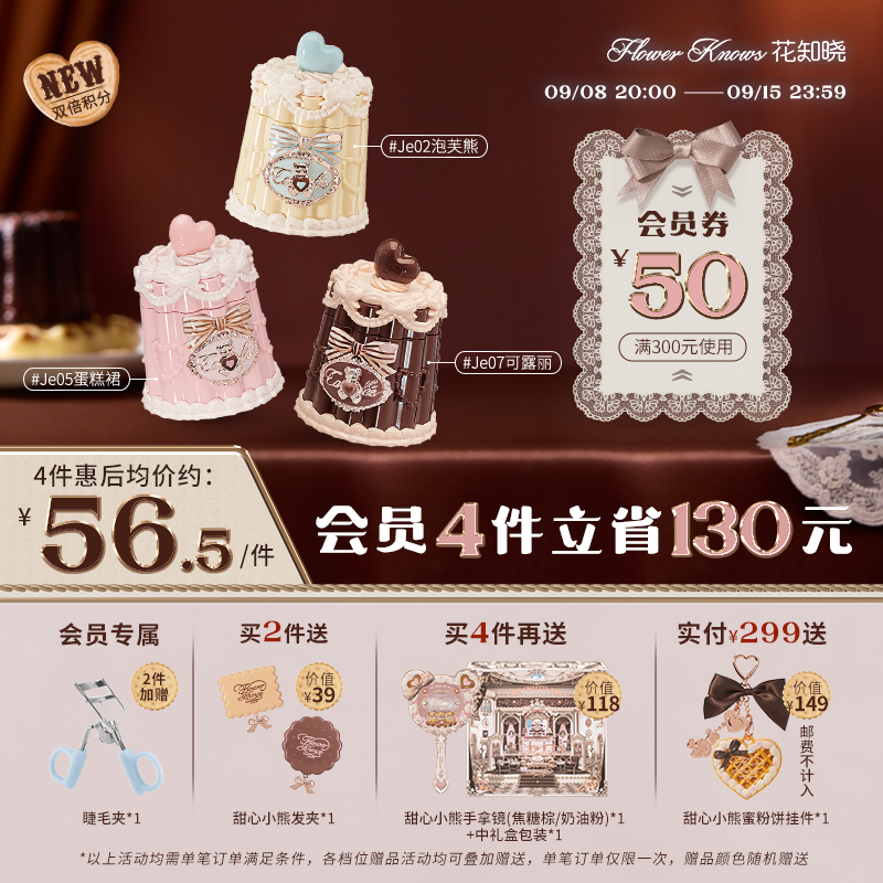 【无门槛9折消费券后62.1,可叠美妆惊喜券,会员加赠平头眼影刷,买3赠九周年气垫梳】可使用店铺300-50会员券,叠加200-20消费券,满4件,均价51.5/件,会员专属两件加赠睫毛夹*1+甜心小熊发夹*1,买4件再送甜心小熊手拿镜(焦糖棕/奶油粉)*1+中礼盒包装*1,实付满299送甜心小熊蜜粉饼挂件*1