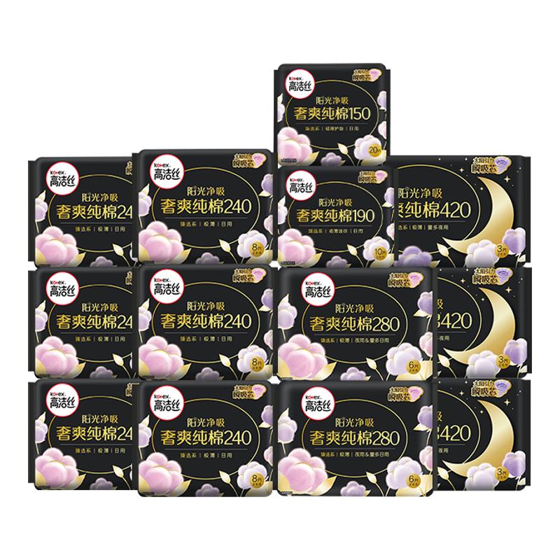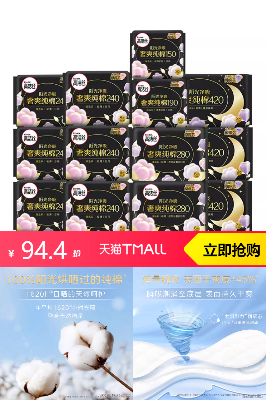 高洁丝 90片高洁丝奢爽纯棉臻选卫生巾姨妈巾组合 129.9元减35.5 商品纠错
