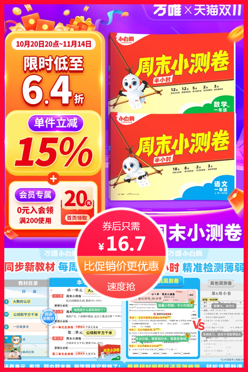 官方立减5.1元+限时秒杀+消费券,到手11.72元,小学测试试卷,同步教材。一周一测,及时掌握每周所学。新课考点全覆盖,同步教材进度,每周末一练!易错专项练,强化周测薄弱点,下次遇到不会错!精选小学名校期中、期末、小升初考试真题,含金量高。