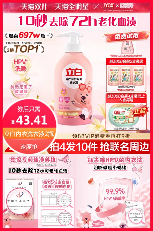 买就送80g试用+大师香氛洗衣液100g*3袋,官方立减11.5元+券15元+右上角进入淘金币省6.57元限时红包3元+88vip省2.17元+9折消费券省3.66元低至29.94元更实惠!内衣内裤洗衣液!弱酸性配方~7大0添加,强效去血渍~有效除菌除螨,48小时长效抑菌!