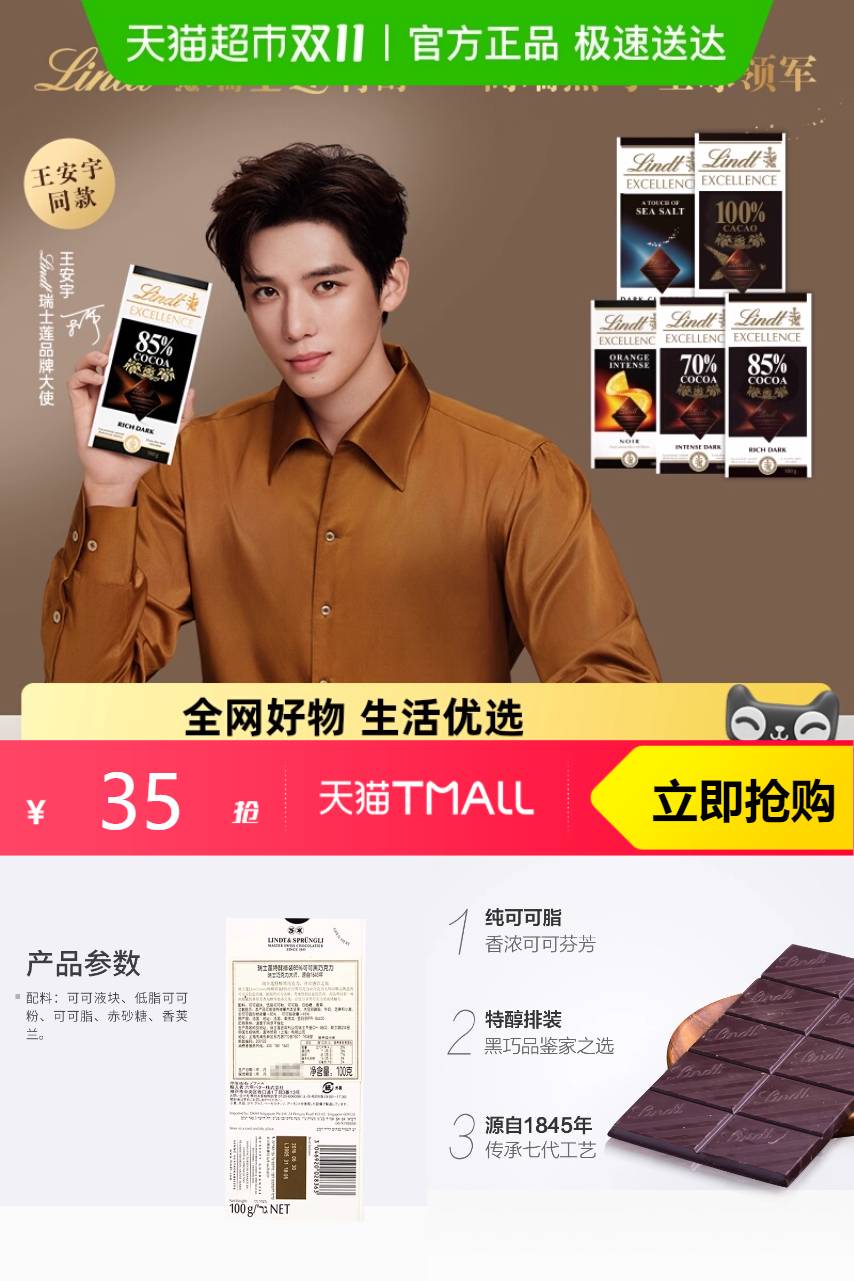 【88vip1.75,淘金币3.49,88VIP双11消费券减2.98,猫超价到礼金3.5,到手23.28】瑞士莲特醇排装系列可可黑巧克力100g,细腻的口感中夹带着巧克力的丝泪和微微的甜味,真是太令人着迷了~