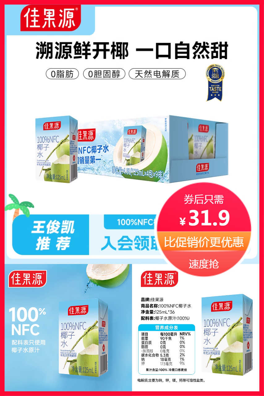 金币后28元【赠运费险】NFC冷榨椰子水!佳果源原汁原味,0脂补水,运动解渴新选择~下拉领补贴更划算,每日鲜饮负担轻,囤货正当时!