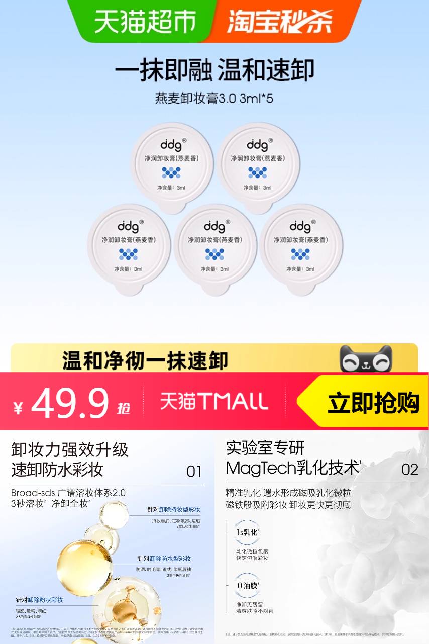 【直降10元,vip立减2.5,淘金币可减0.4元,到手47元,9折消费券到手42.3元】【新升级】ddg燕麦卸妆膏2.0便携5组,超赞!