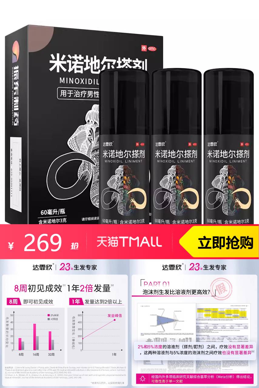 【叠加阿里药房购物券(500-40)抵扣33.12元+淘金币33.12元+消费券9折=182.48元。合计单瓶60.82元】达霏欣米诺地尔搽剂2%*60ml*3盒,1.2倍高渗透 8周速生发~