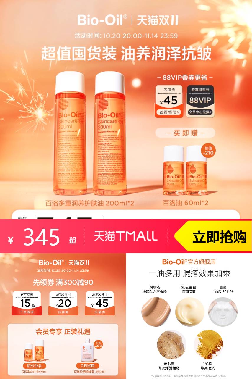 【送60ml*2瓶百洛油,消费券到手310.5】百洛精华油抗皱敏感肌适用200ml*2瓶,以油养肤,一油多用~