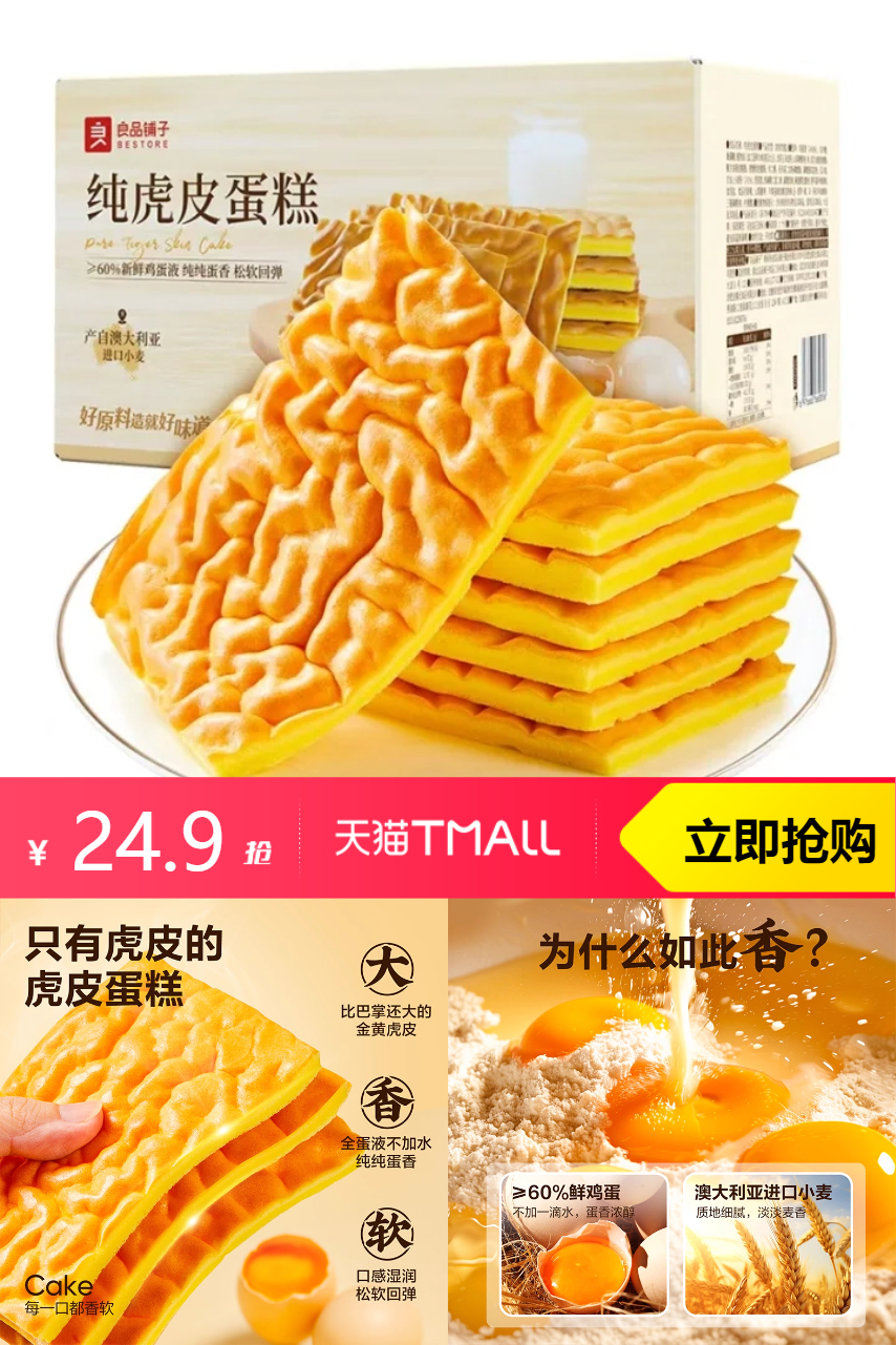 【88vip95折可优惠1.25,淘金币可优惠2.08,限时淘礼金0.79,半日达惊喜红包3元,到手价17.78】外皮酥香,内里松软,良品铺子虎皮蛋糕选用优质原料精制而成,口感细腻,适合儿童、老人及上班族享用。经典虎皮风味,还原传统手工蛋糕的醇正味道,是日常居家、办公、出行的理想糕点选择。