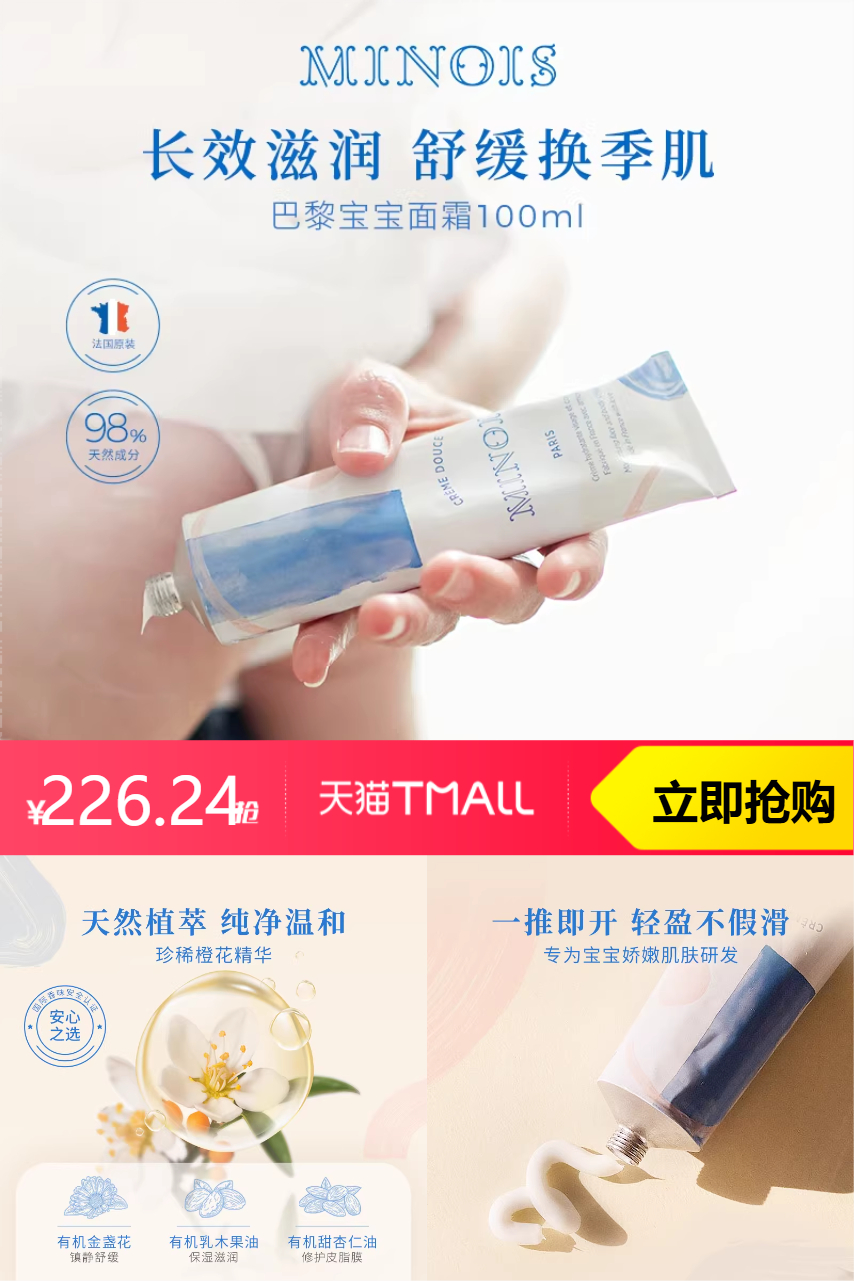minois巴黎宝宝婴幼儿专用面霜春夏 298元减71.76 商品纠错
