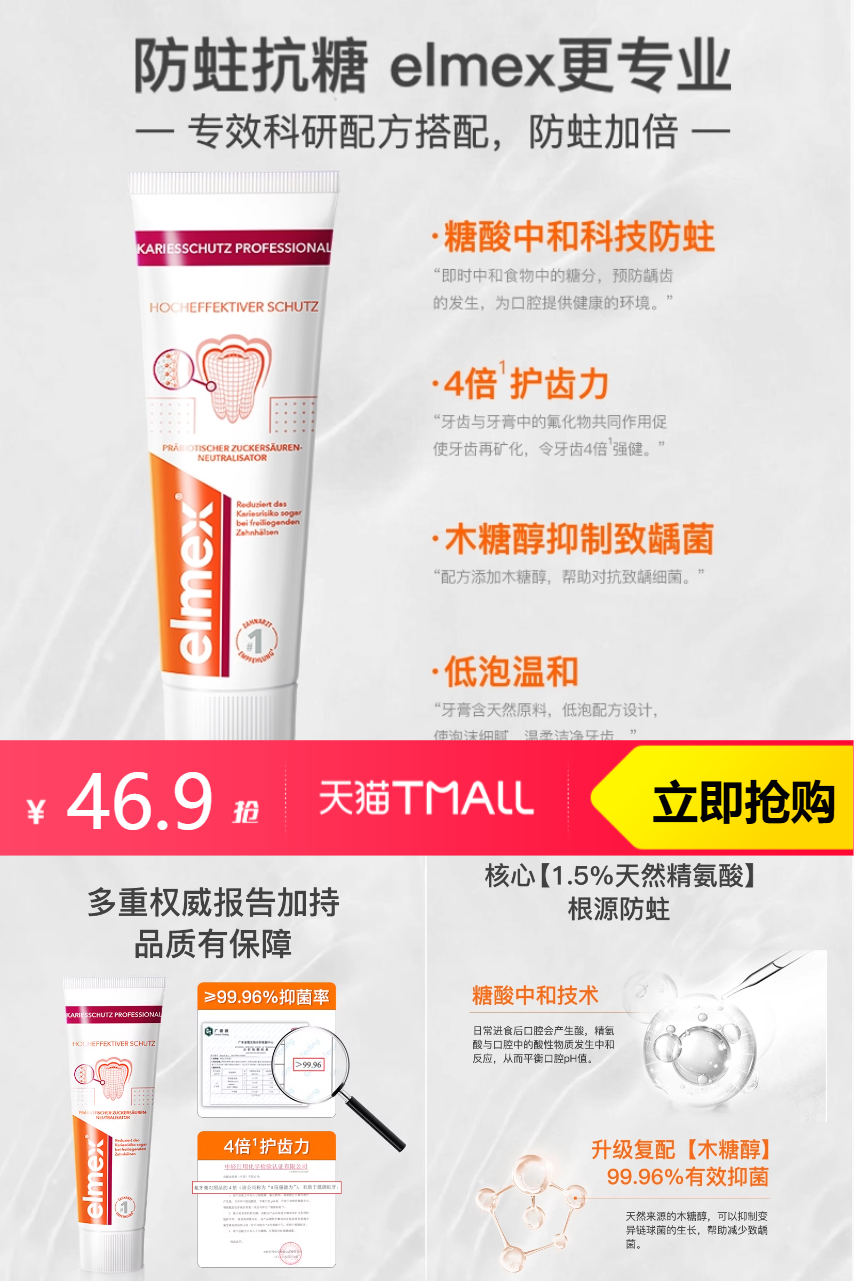 【到手价:34.49元【46.9(淘客到手价) - 7.71(淘金币频道内抵扣)】*88折消费券,买2/3支装赠成人牙刷单支装*1】elmex艾美适成人防蛀牙膏固齿含氟牙膏,糖酸中和科技 ,4倍 强健牙齿~