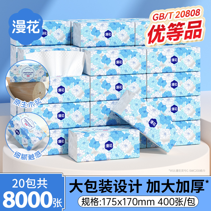 推荐:漫花400张大包L码抽纸家用实惠装整箱宿舍厕所纸餐巾纸卫生纸面巾