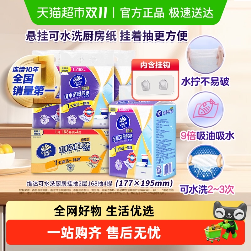 【详情享优惠】维达悬挂式厨房抽纸168抽4提L码可水洗去油污整