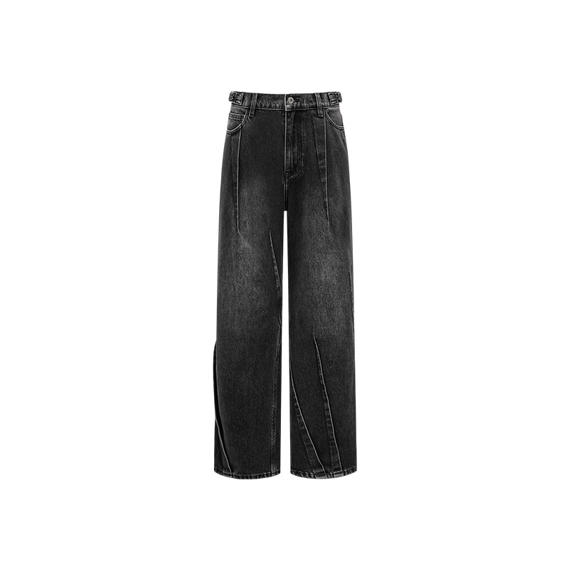 这是FengChenWang解构系列的黑色水洗牛仔压褶中性款长裤牛仔裤,设计独特,集舒适与时尚于一体,让小李无论是在都市还是郊外,都能自如应对,保持舒适。裤身选用黑色水洗牛仔材质,中高腰设计,搭配合体直筒版型和压皱工艺,既显瘦又显高。裤长为长裤,宽松裤型更是提供了极佳的穿着体验。这款牛仔裤不仅适合四季穿着,还提供了多种尺码(L、M、S、XL、XS)供选择,满足不同体型的需求。