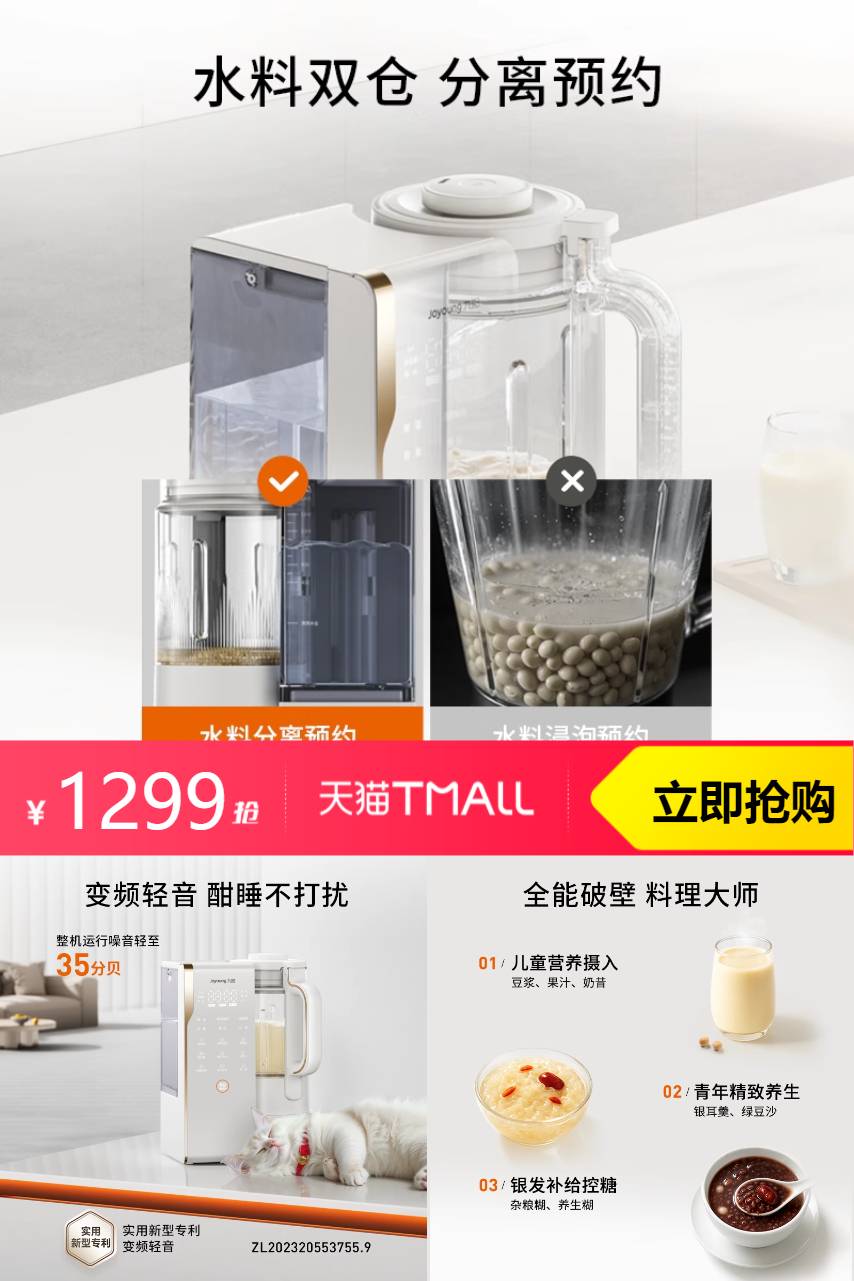 【官方补贴+88vip+淘金币+消费券+政府补贴到手795】九阳变频轻音破壁机,家用全自动豆浆机搅拌料理机烹饪机新品B1U,再也不用担心有噪音啦~