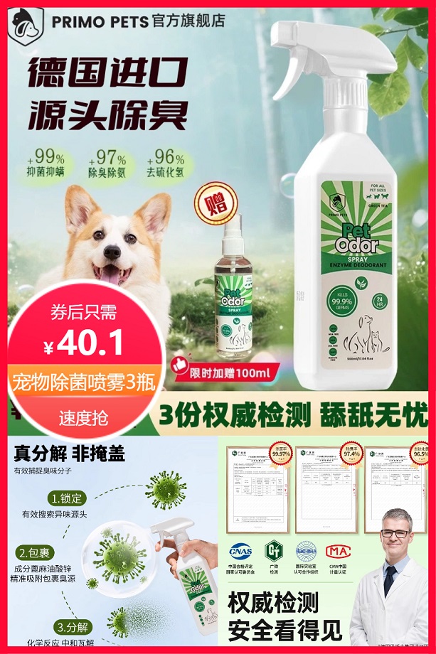 推荐:宠物猫狗杀菌除氨除臭喷雾3瓶