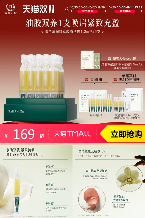 【首单17元,立减34元,消费券可抵16.9元+淘金币减3元,到手132.1元,买即赠:胶原次抛1.2ml*10支】油胶双养,1支唤启紧致充盈!云南昭通天麻兰提取物+莲瓣兰花提取物+大马士革玫瑰,双兰精萃,效果加乘!进阶改善3大肌肤维度!让肌肤弹性更紧致!