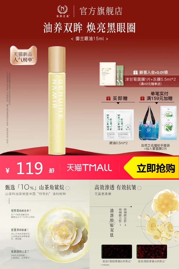 【首单3元,立减24元+消费券抵11.74元+淘金币2元,到手102.67元,赠送油膜2片】甄选10%山茶角鲨烷!以油养眼,直击眼部问题,高效渗透,有效抗皱,充盈更柔嫩,无惧初老,焕发眼周光彩!