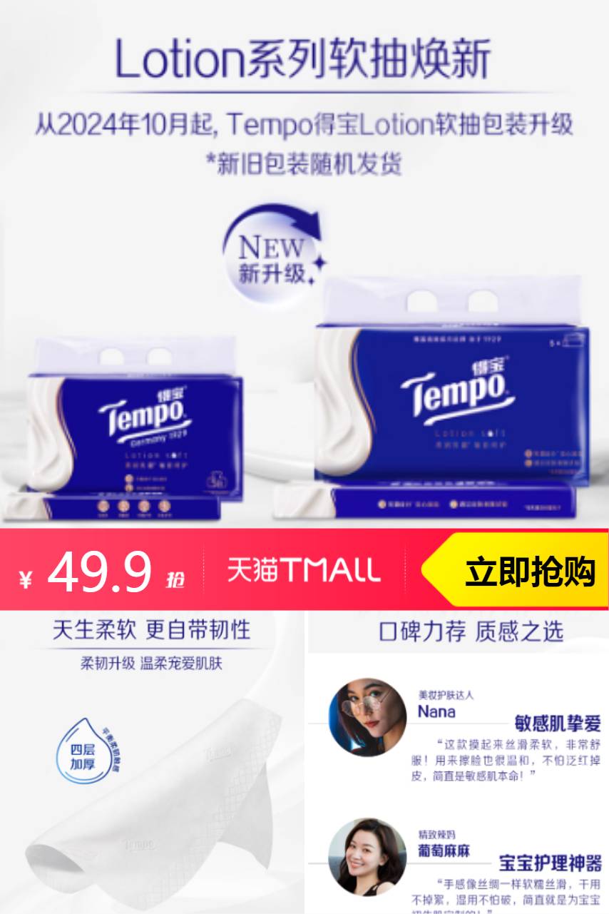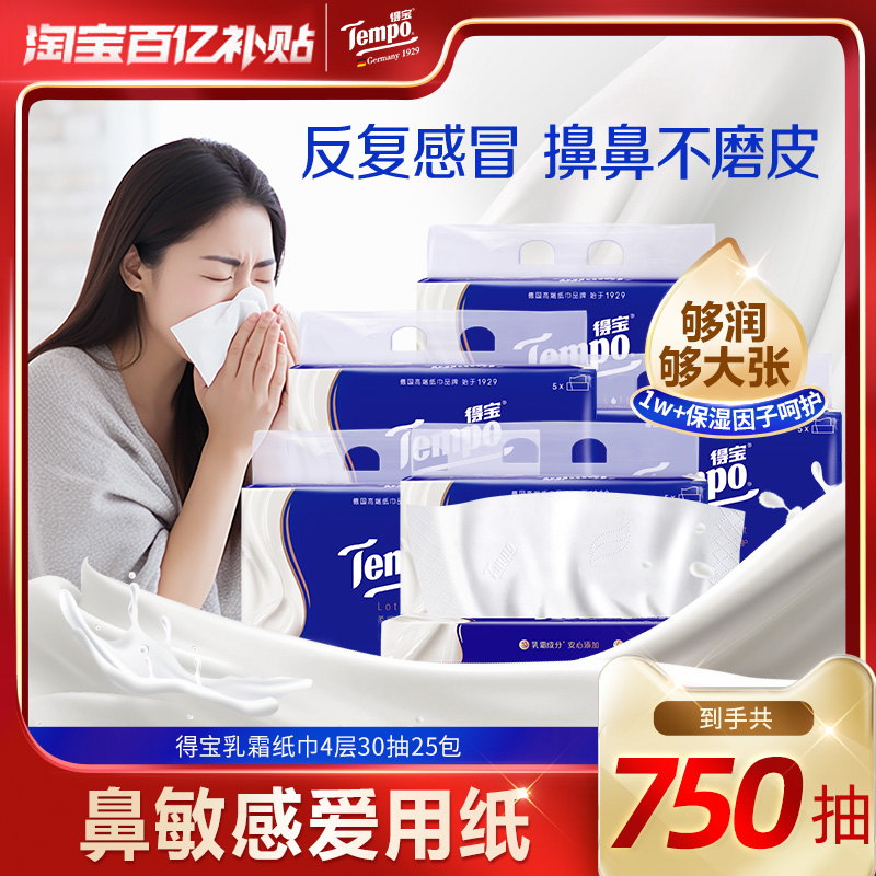 【百补到手49.9,叠加淘金币和九折消费券到手仅需44.64】Tempo得宝乳霜纸巾4层30抽25包,柔润呵护,敏肌安心。