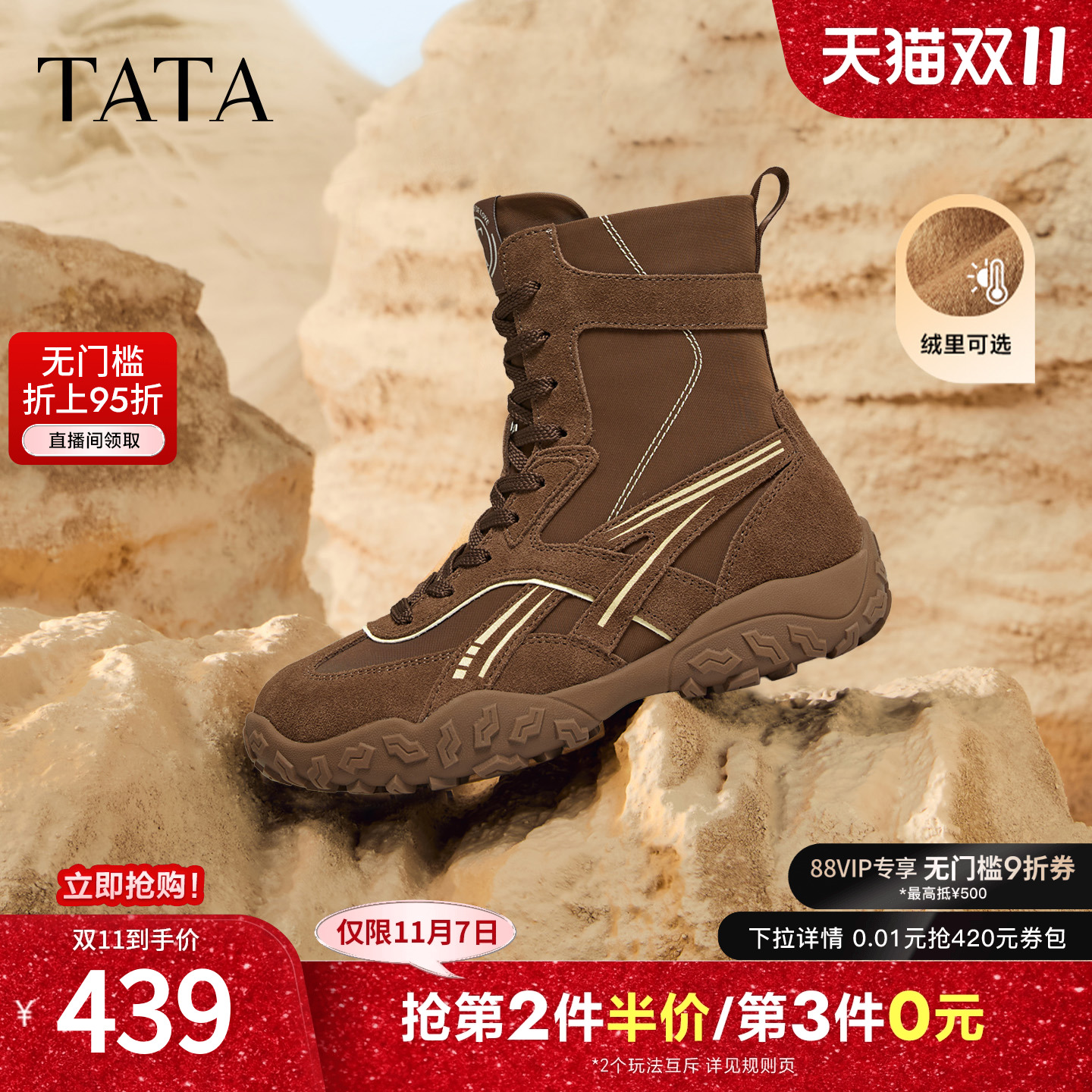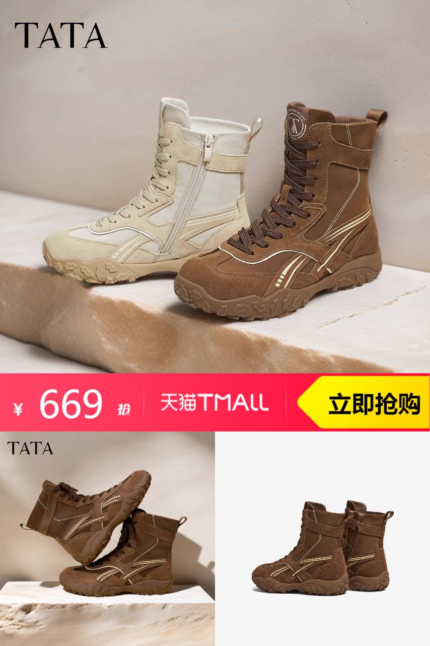 【无门槛9折券,官方立减180元,88VIP95折立减21.95元,满500元减50元到手375.35元;店铺有无门槛红包】TATA他她拳击靴2025新款运动阿甘鞋,麂皮与网面,温柔相织,皮面纹理如细腻沙画,触感似第二层肌肤,低调诠释奢华层次感。