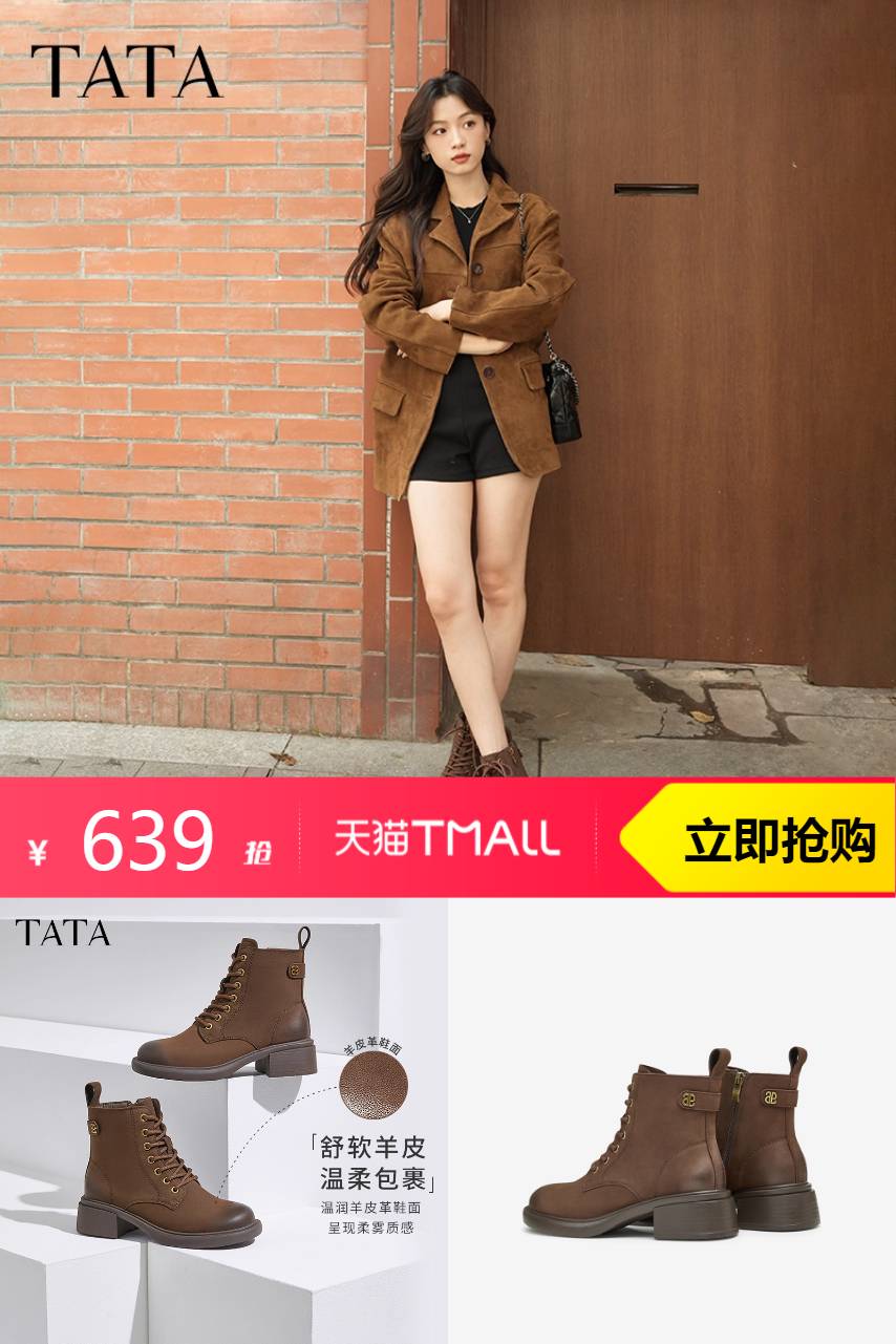 【无门槛9折券,官方立减190元,88VIP95折立减19.95元,店铺券满500减50到手341.15元,店铺有无门槛红包】这款Tata他她粗跟复古马丁靴以啡色和黑色为主打,展现出经典休闲的魅力。圆头设计与交叉绑带元素巧妙结合,让双脚显得更加修长,同时还能提升整体造型的时尚感。粗跟中跟设计不仅提供舒适的穿着体验,更能展现女性的优雅与自信。精选羊皮帮面与头层猪皮鞋垫,确保每一脚都倍感舒适。