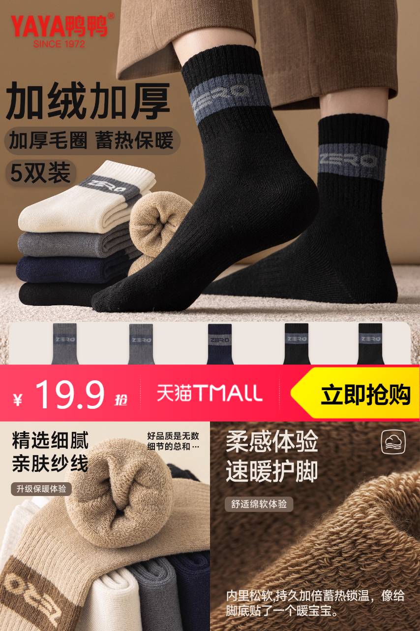 鸭鸭 鸭鸭加厚袜子男款秋冬中筒超厚羊毛袜5双 39.9元减6 商品纠错