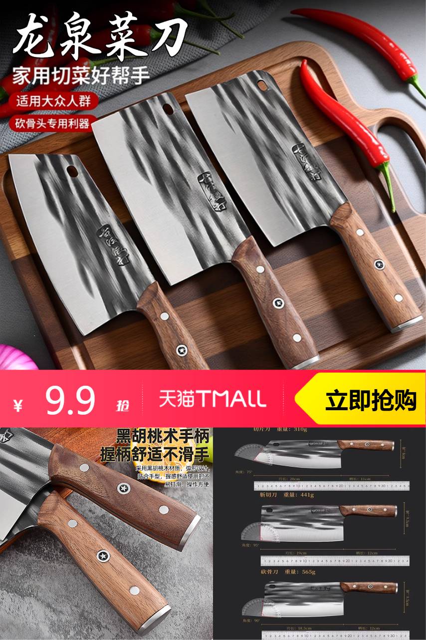 【双十一超级红包抵扣0.33元,淘金币抵扣0.4元,到手价9.17元】龙泉菜刀家用锋利砍骨头专用刀,承自古法 锻打工艺,以匠心传承,钢与火的淬炼每一把刀皆由人工一锤锤锻打而成~