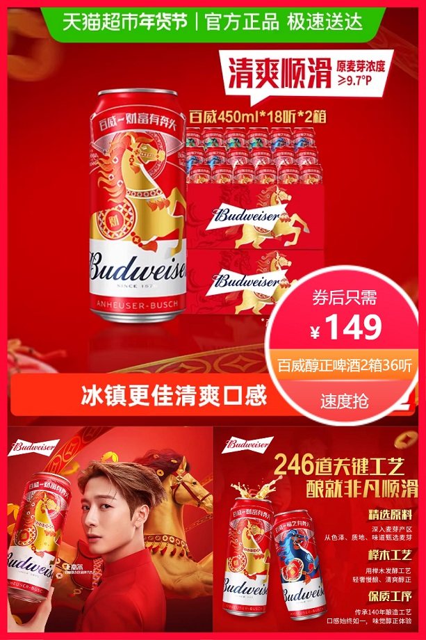 超级立减40元+券25元+点击右上角三个点进入淘金币省4元后约149元,叠加消费券200-25后130元,单罐只需3.6元,百威经典醇正啤酒450ml*36听,9.7°P铝罐整箱,精选原料,榉木发酵,轻奢慢酿,口感醇正,细腻顺滑,新装百威,庆祝正当时,朋友聚会来一杯,还得选百威!