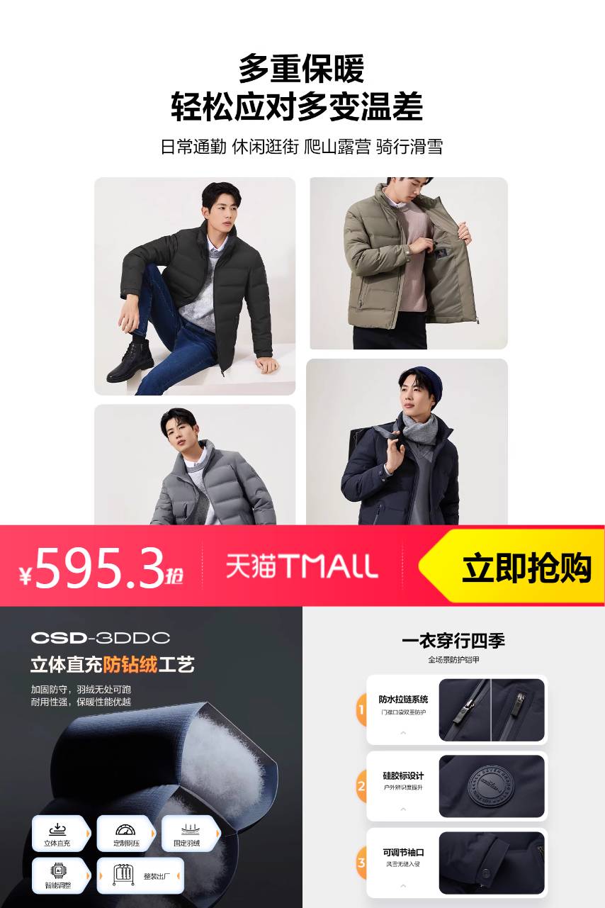 【有20% 天降礼金,官方立减128,单品直降127.7服饰天降券减12,淘金币抵扣35.02,消费券抵扣51.91,到手457.17】拒水鸭绒柒牌三防羽绒服男防风立领保暖外套,水洗不湿不结团技术看得见的拒水,御寒体验更舒适~