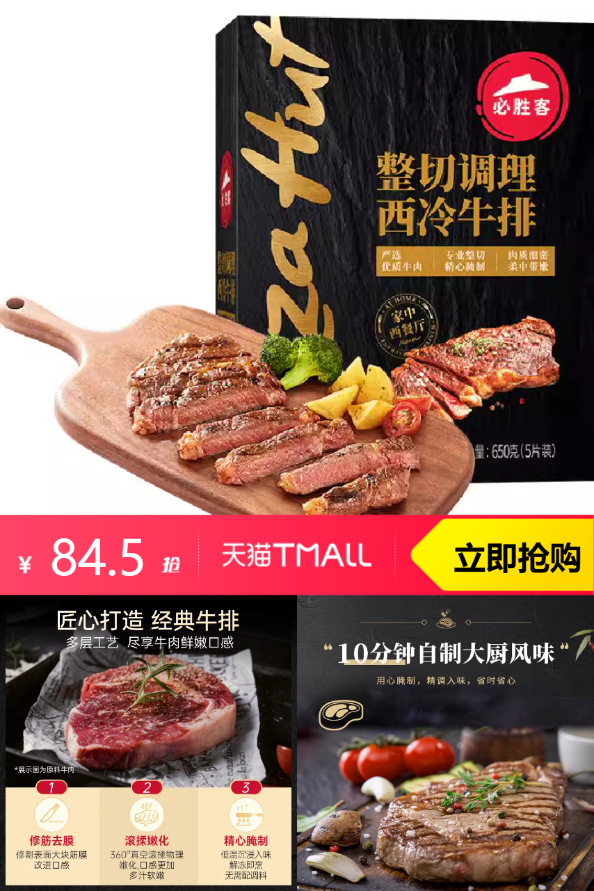 【88VIP3.98,超市补贴5,淘金币5.49,到手价70.03】必胜客必胜优选调理西冷牛排冷冻牛扒牛肉,1.0.0%真西冷,原肉整切,承诺不拼接!!精致西餐家中享!!调理西冷牛排,安心之选,匠心非合成,承诺不拼接!家庭聚餐、朋友聚会,选必胜优选牛排,品质保证,味美难忘!