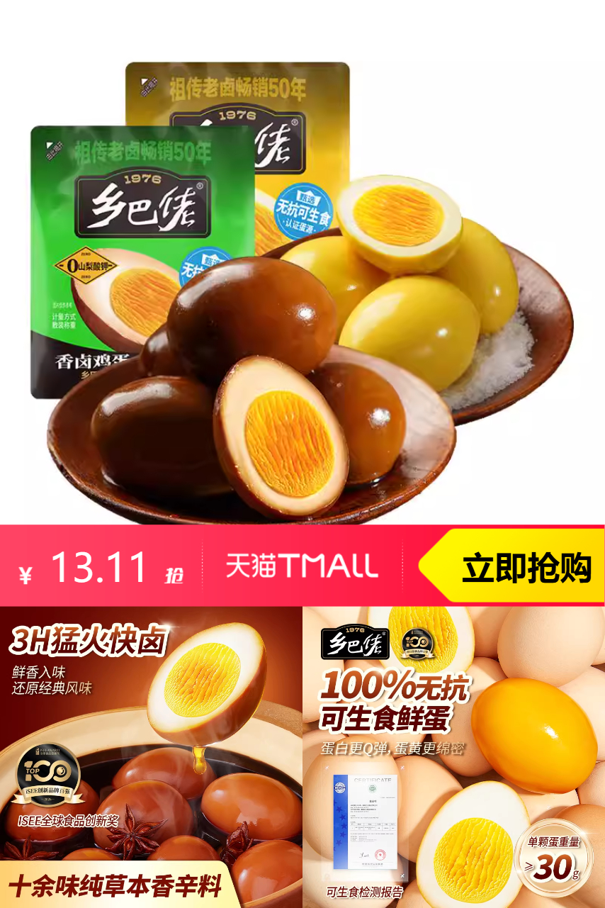 乡巴佬卤蛋盐焗鸡蛋鹌鹑蛋整箱即食零食【原价34.9-官方限时补贴9.79元-12元券=13.11元,淘金币0.69元,限时红包1元,到手11.42元】乡巴佬香卤蛋,传承老卤,童年味道