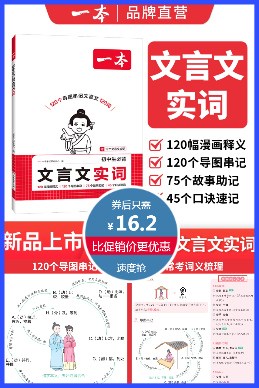 福利包0.26元叠加劵15.94元!一本初中生必背文言文实词,120幅漫画释义,120个导图串记,75个故事助记,45个口诀速记,常考词义梳理,提升孩子成绩!