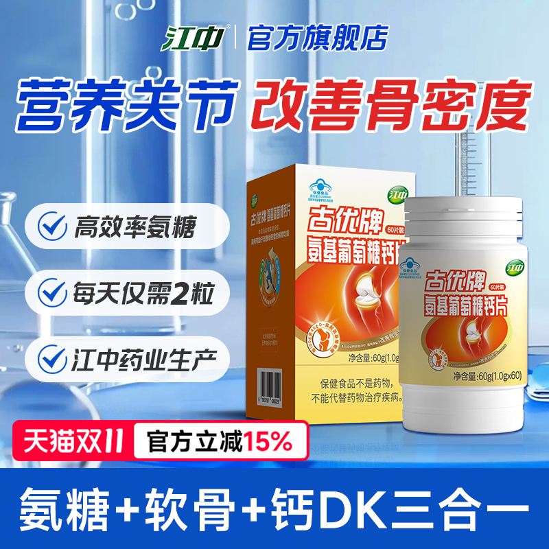 这可是国民老品牌了!江中旗舰店•氨基葡萄糖钙片60粒/19亓。有效增加骨密度、保护关节、防止小腿抽筋!蓝帽子认证!氨糖+软骨+钙DK,三效同补!