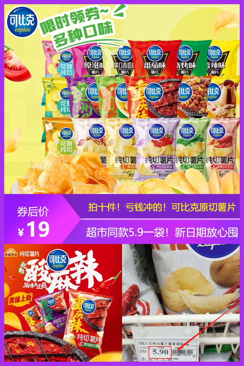 19拿下 10 袋!超市5.9一袋呢!可比克原切薯片!亏钱冲销量不玩虚的~ 原切工艺锁鲜,薄脆无负担,咸香、番茄、烧烤多口味任选。追剧、解馋、囤货都适配,手慢直接无,闭眼囤就对了!