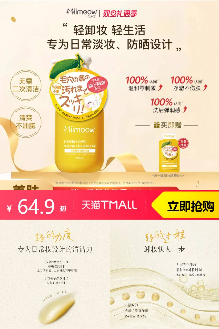 【原价99.9元-官方立减30元-5元券=64.9元,淘金币5.98元,可叠加消费券,到手51.56元起】咪一喵经典版柚子卸妆乳卸妆啫喱150ml,清爽不油腻~