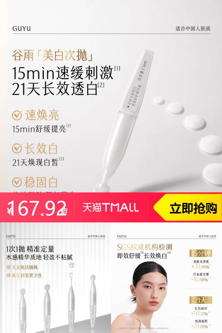【立减60+淘金币31.08+消费券抵扣20.99到手146.93元+赠黑金针胶原25支+店铺备注加赠5支,到手60支】2/支❗谷雨第3代美白次抛,含贈到手1.5ml*60支💰123,📌下單备注加贈次抛5支+奶皮面膜2片,重磅升级!谷雨美白次抛精华液,专研配方深层补水,提亮肤色淡斑更舒缓,肌肤焕白看得见~