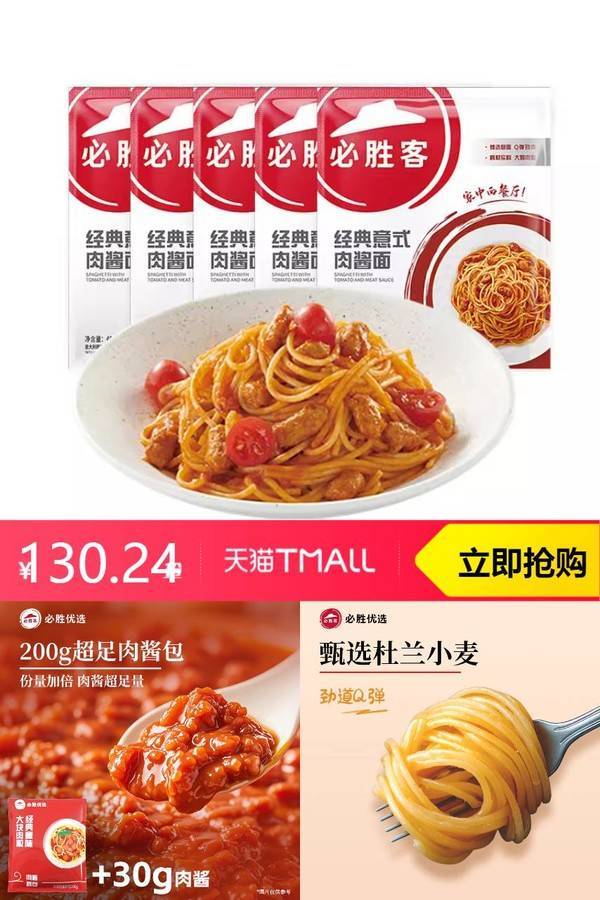 【立减60,叠加88折消费券 到手130.24, 江浙沪前2500单下单备注恭喜发财赠意面。】必胜客意大利面番茄肉酱海鲜免煮意面,鲜香美味,舌尖炸裂体验。