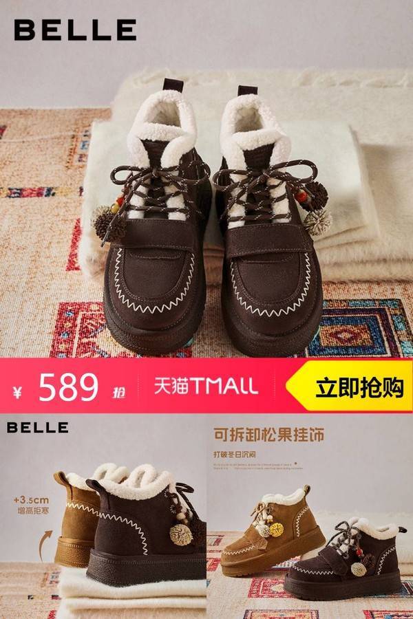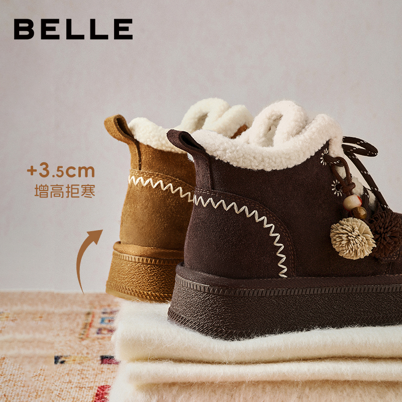 【领90券+淘金币+消费券到手424】沈羽洁同款百丽姜饼屋厚底加绒雪地靴,持久保暖不冻脚软糯亲肤,柔软环绕高帮护踝~