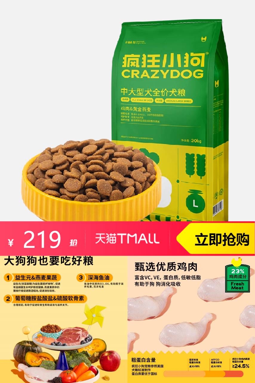 【叠加88vip95折抵扣10.95元+9.7折平台限时无门槛券抵扣6.24元+88vip双12消费券14.84元+淘金币5.38元+满480-60券到手171.95元】疯狂小狗狗粮40斤装大型犬宠物狗粮通用,超赞!